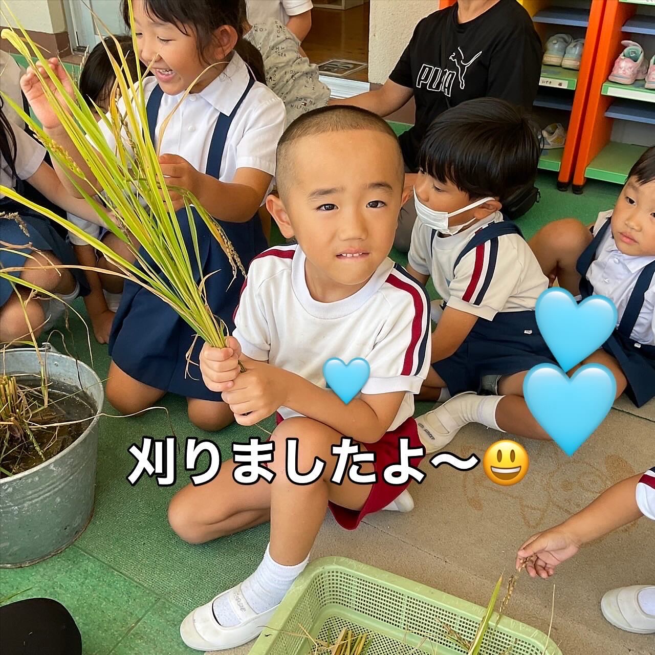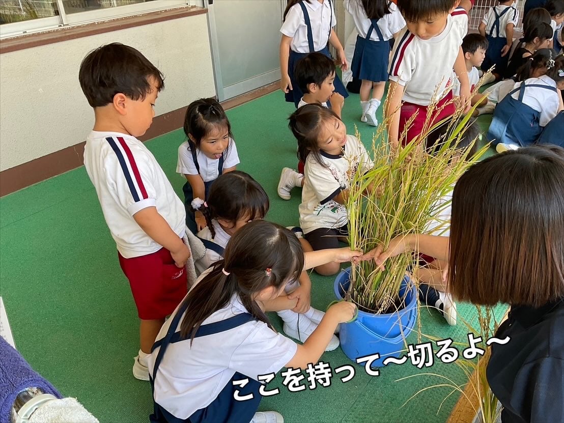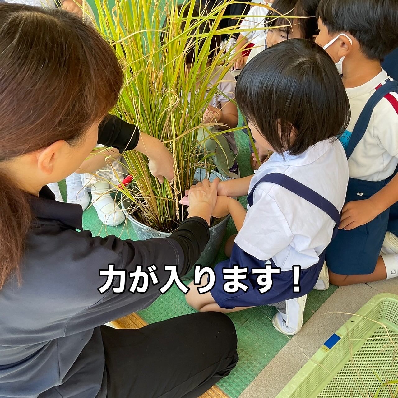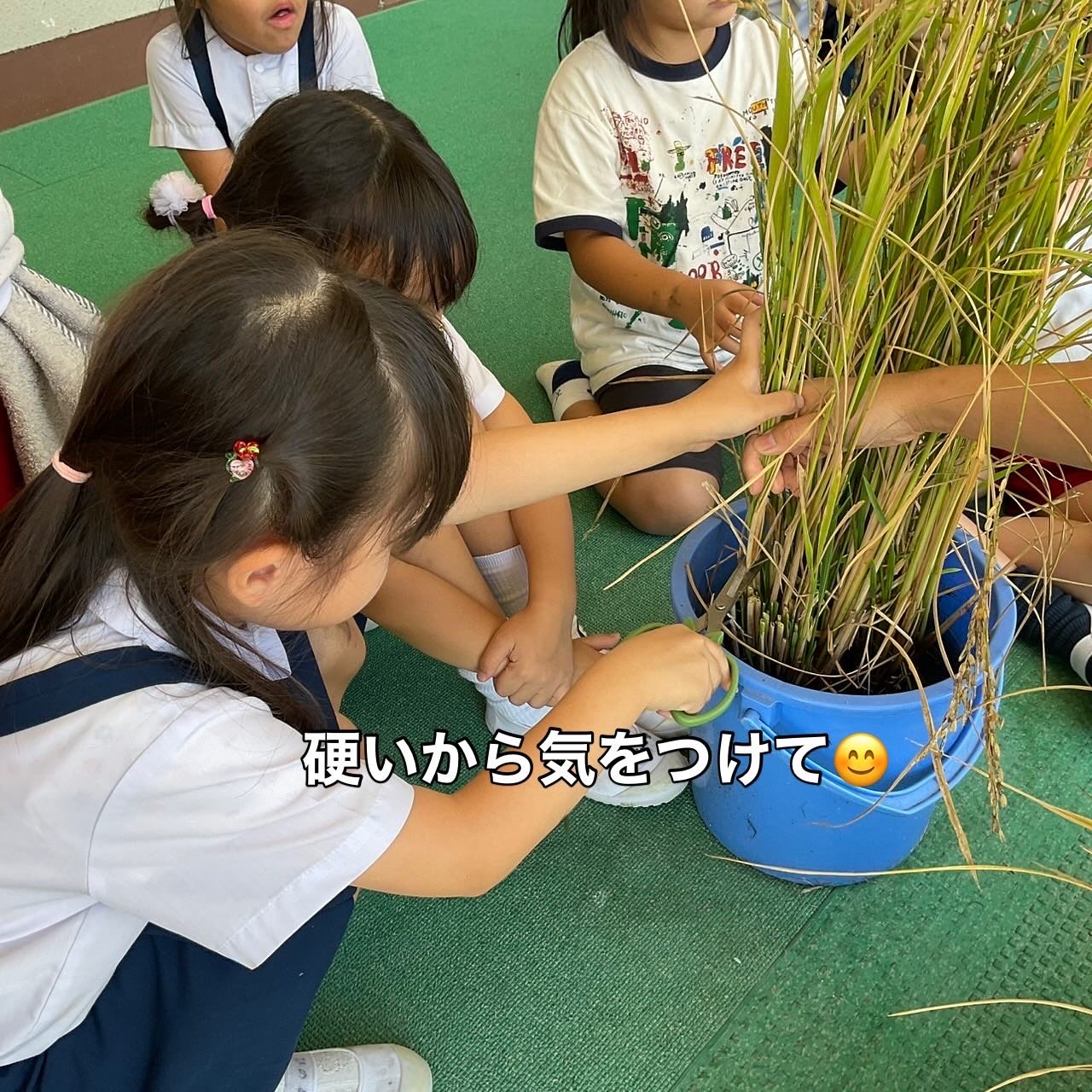 鎌は危ないので、ハサミで切ることに…。しかしこれが硬いのなんのって(;'∀')💦力持ちの年長さんでも一苦労しながら、先生たちと力を合わせて刈りました✌