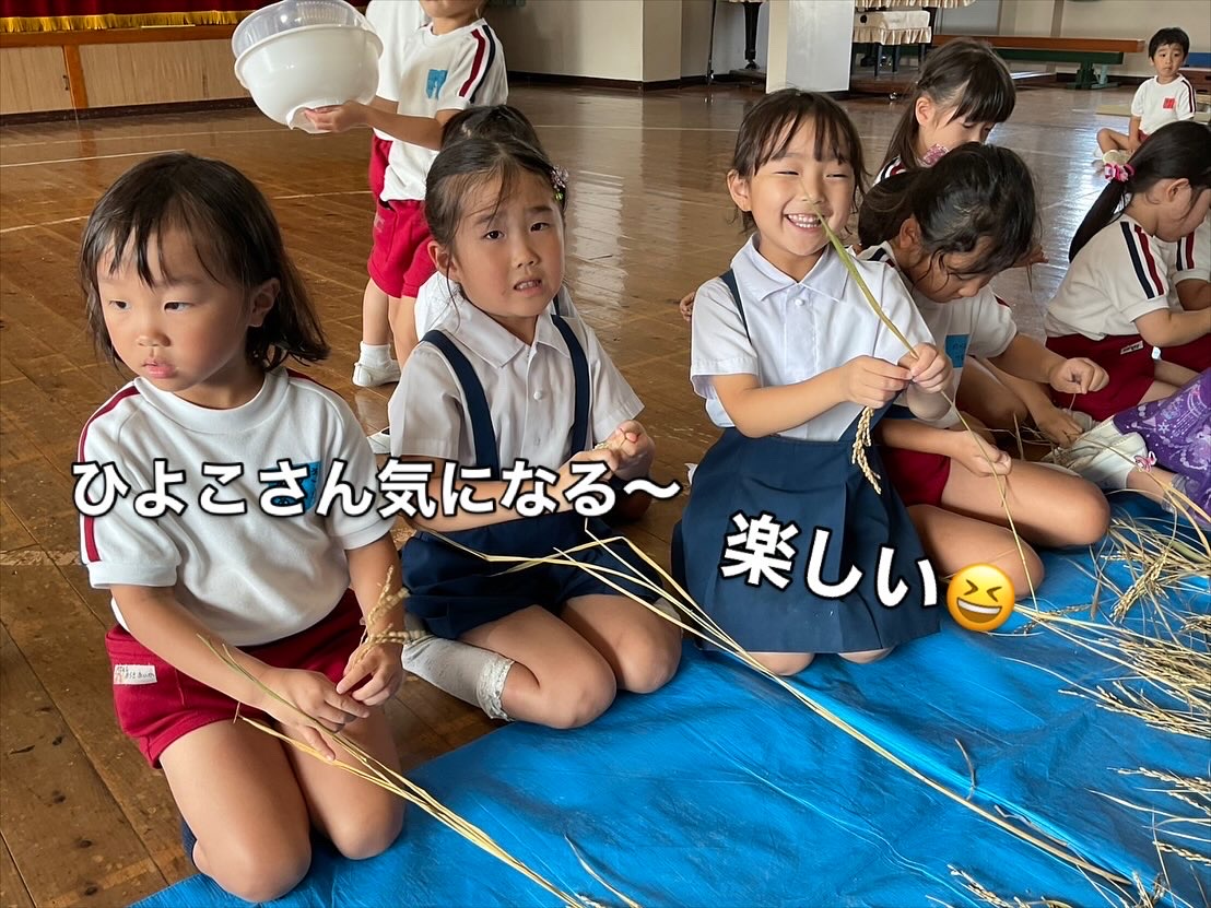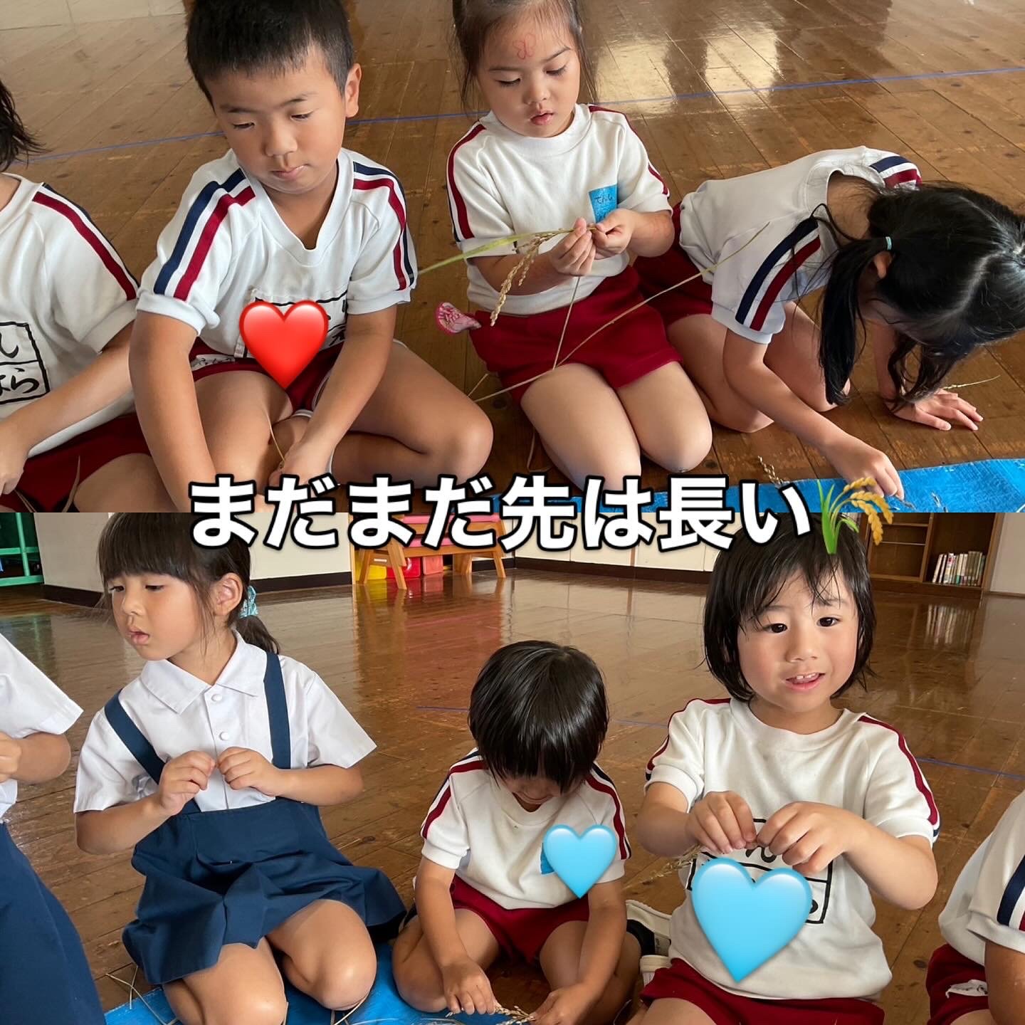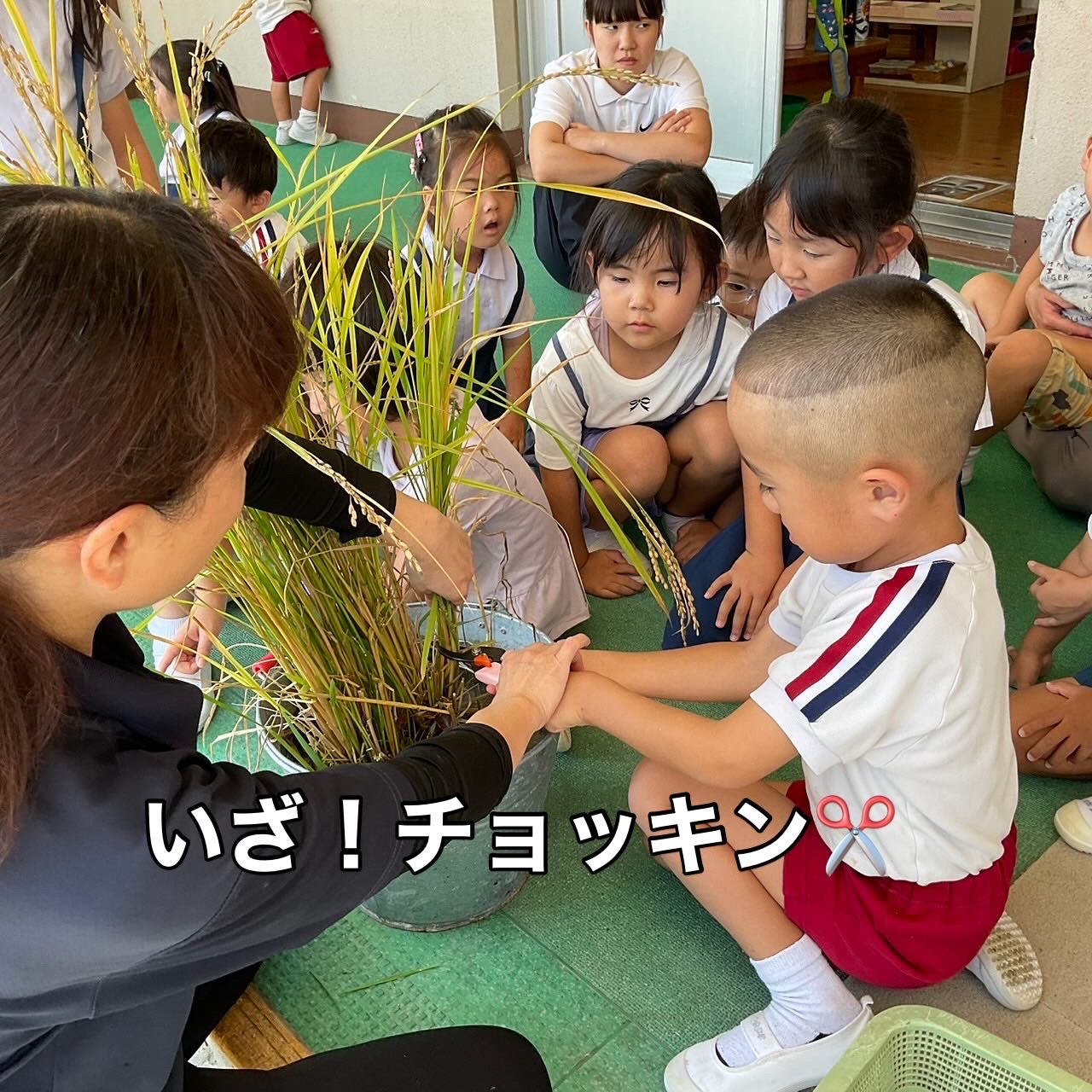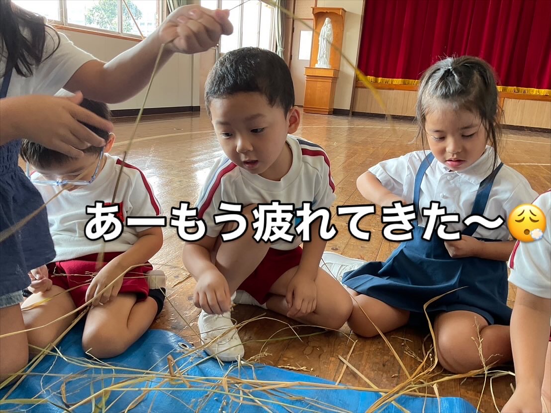 鎌は危ないので、ハサミで切ることに…。しかしこれが硬いのなんのって(;'∀')💦力持ちの年長さんでも一苦労しながら、先生たちと力を合わせて刈りました✌