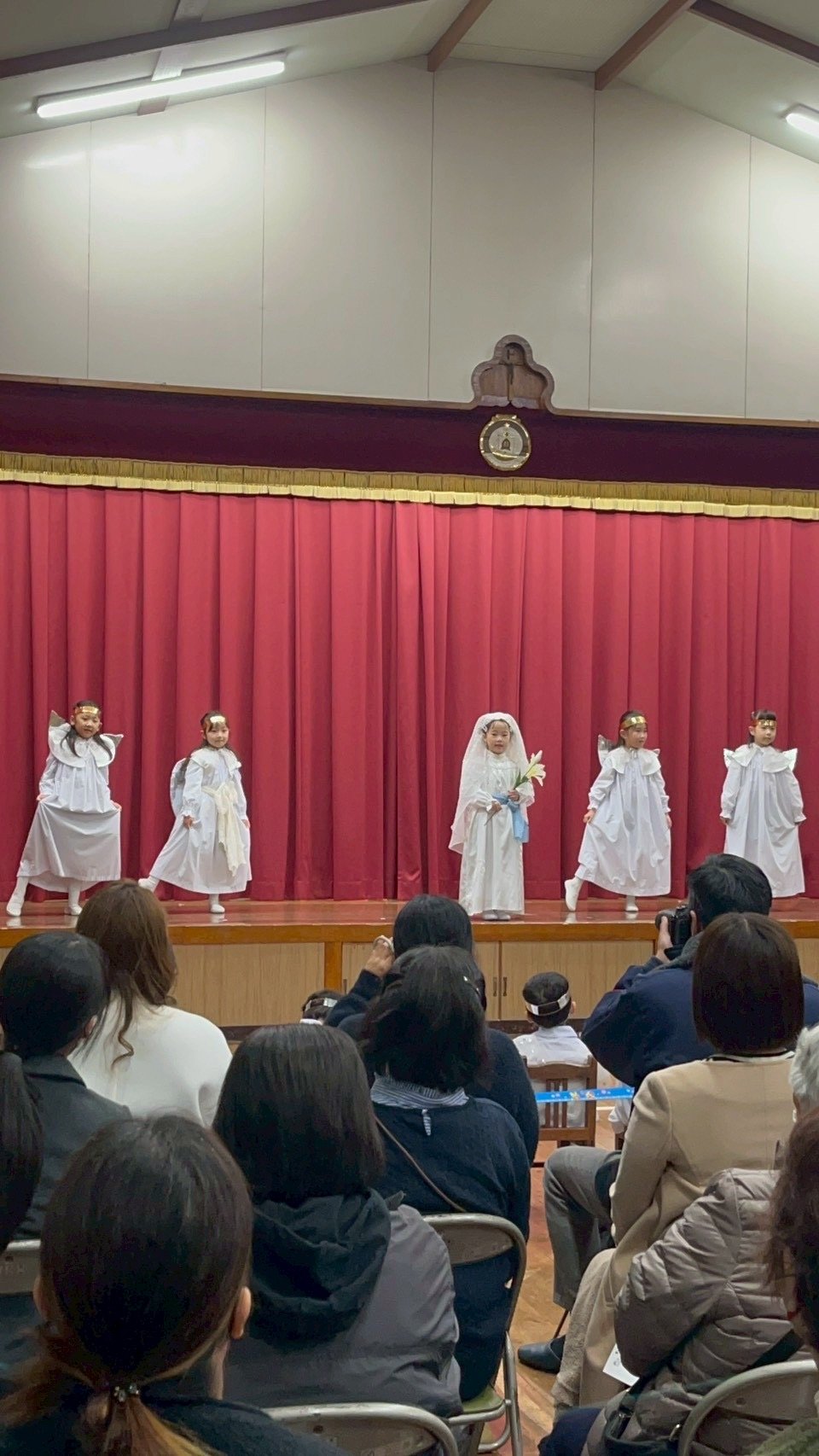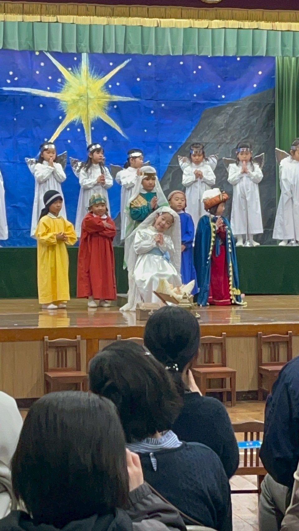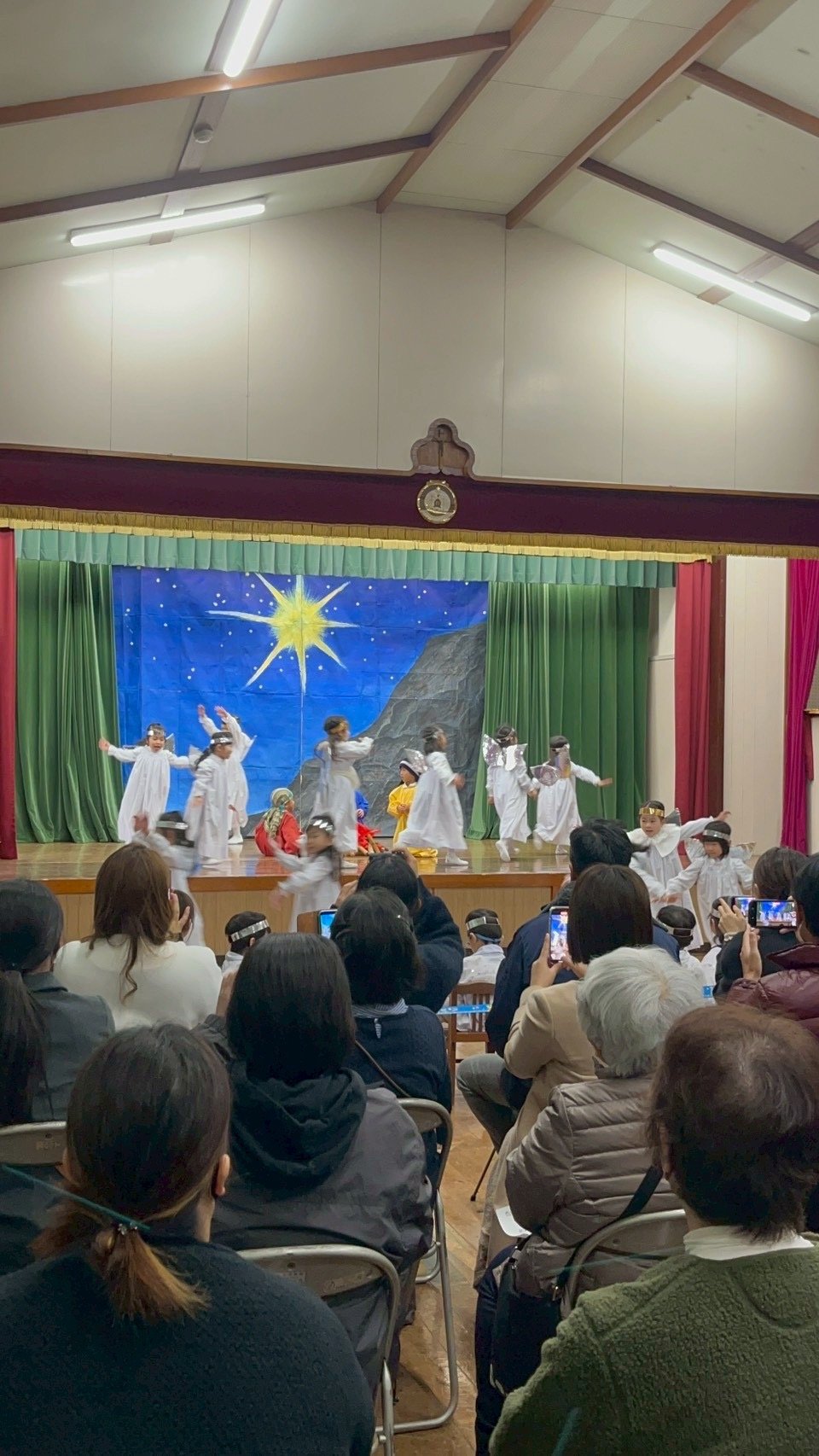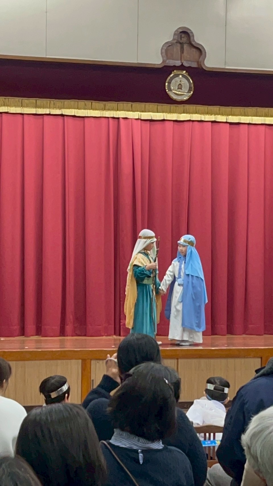 12月9日火曜日、聖劇を行いました。毎日少しずつ練習を重ね、本番ではたくさんのお家の方や神父さま、教会の方々の前で堂々とした姿を魅せてくれました。年長組は自分で選んだ役に責任をもって演じる頼もしさや美しさがありました。年中組はそれぞれ羊飼いと天使になり、元気な歌声を響かせてくれました。年少、年少少組は線上歩行やフィナーレで一生懸命かつ可愛らしい姿を見せてくれました。イエスさまがお生まれになる喜びが周りの方々や神さまに伝わっていますように。