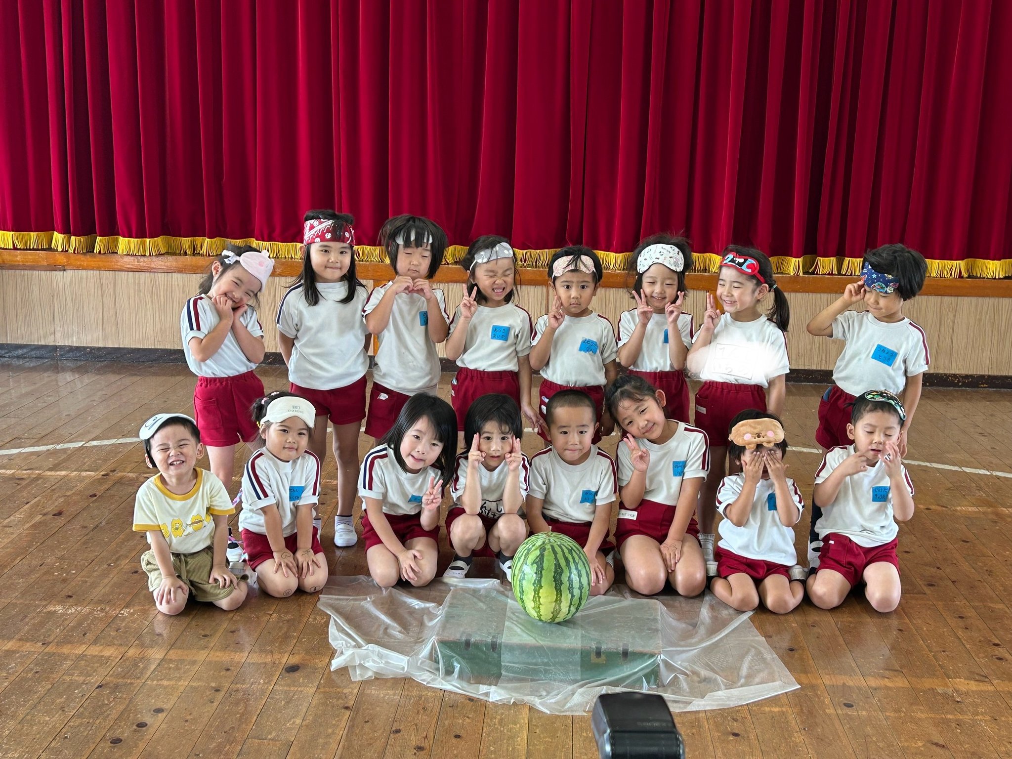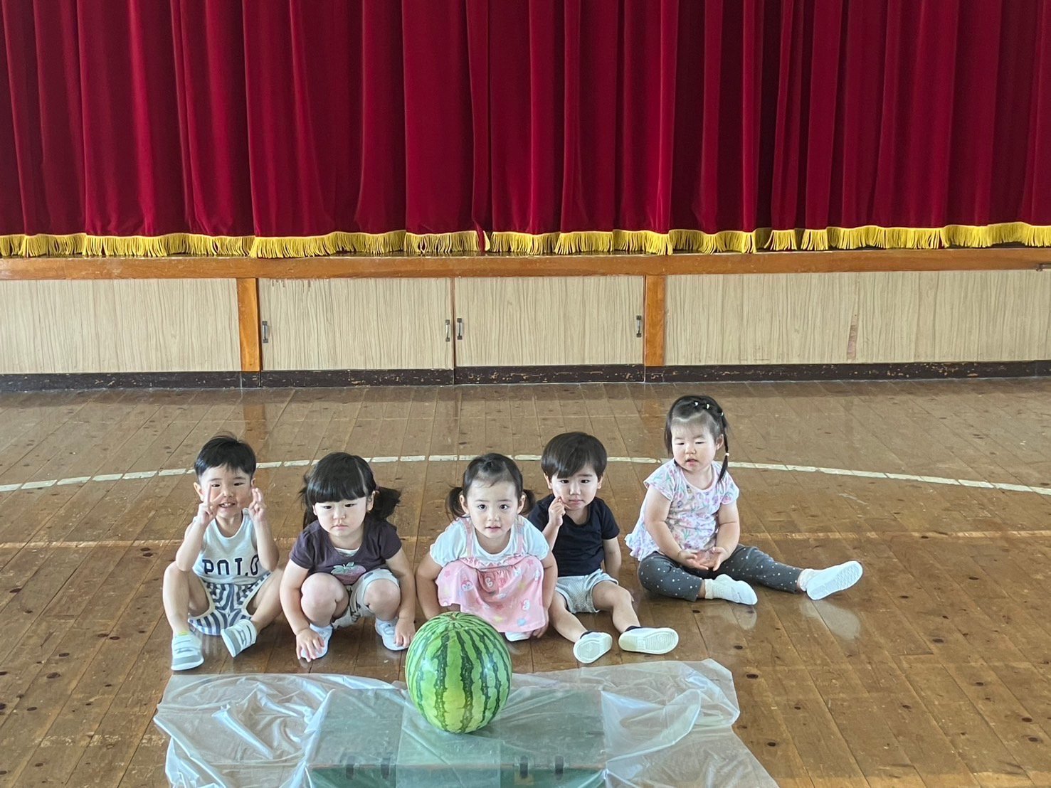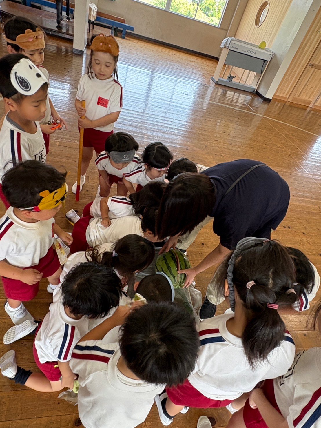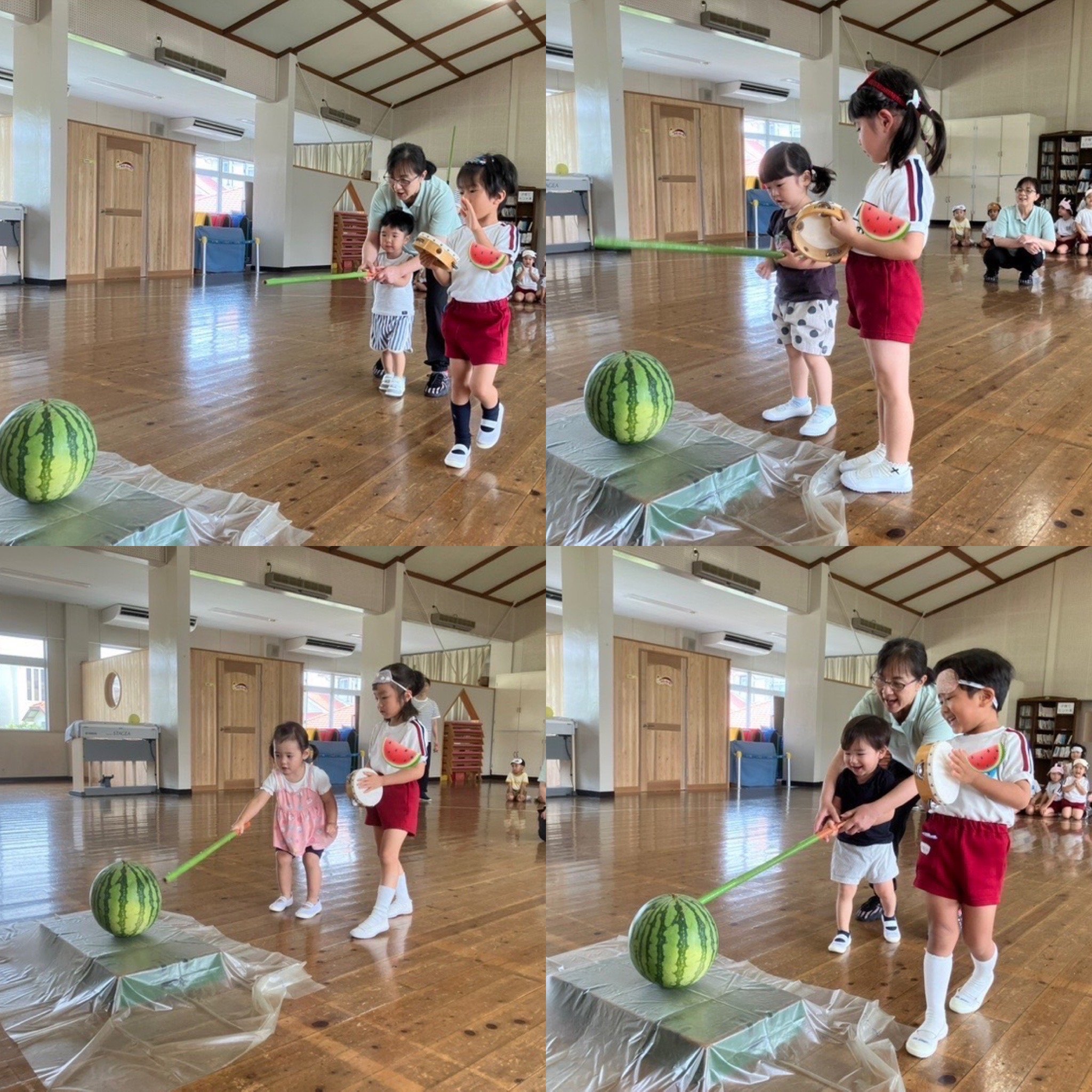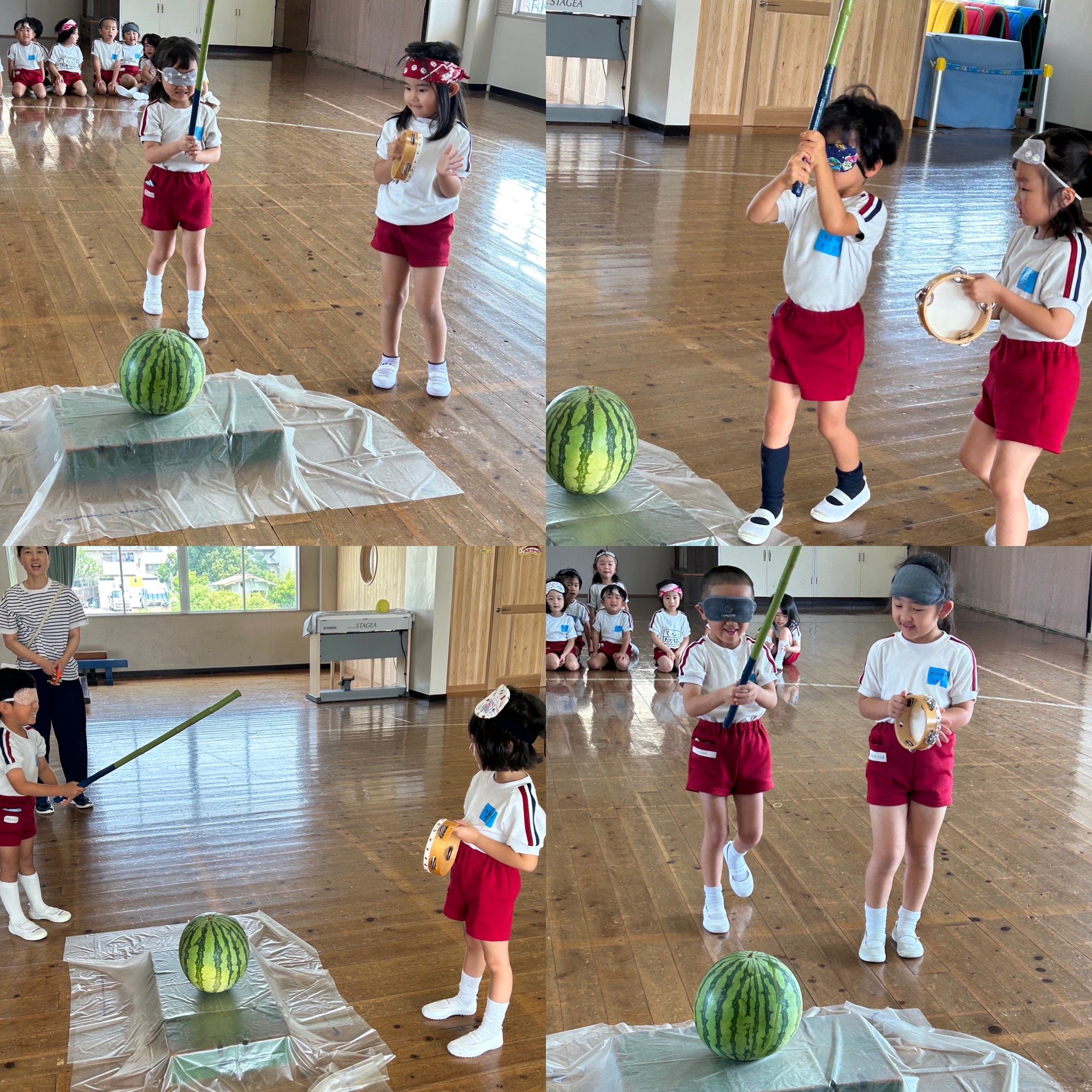 7月3日、すいかわりを各クラスで行いました。ずっと楽しみにしていた行事!スイカが大好きな子も、食べるのが苦手な子どもも「絶対わるぞ!」という思いは共通して熱い!!棒を握る手に、誘導する楽器に、そして応援の声にもたくさんの力が込められていました。どのクラスもあっぱれ!見事にひびが入り、おいしく給食のデザートで頂きました。