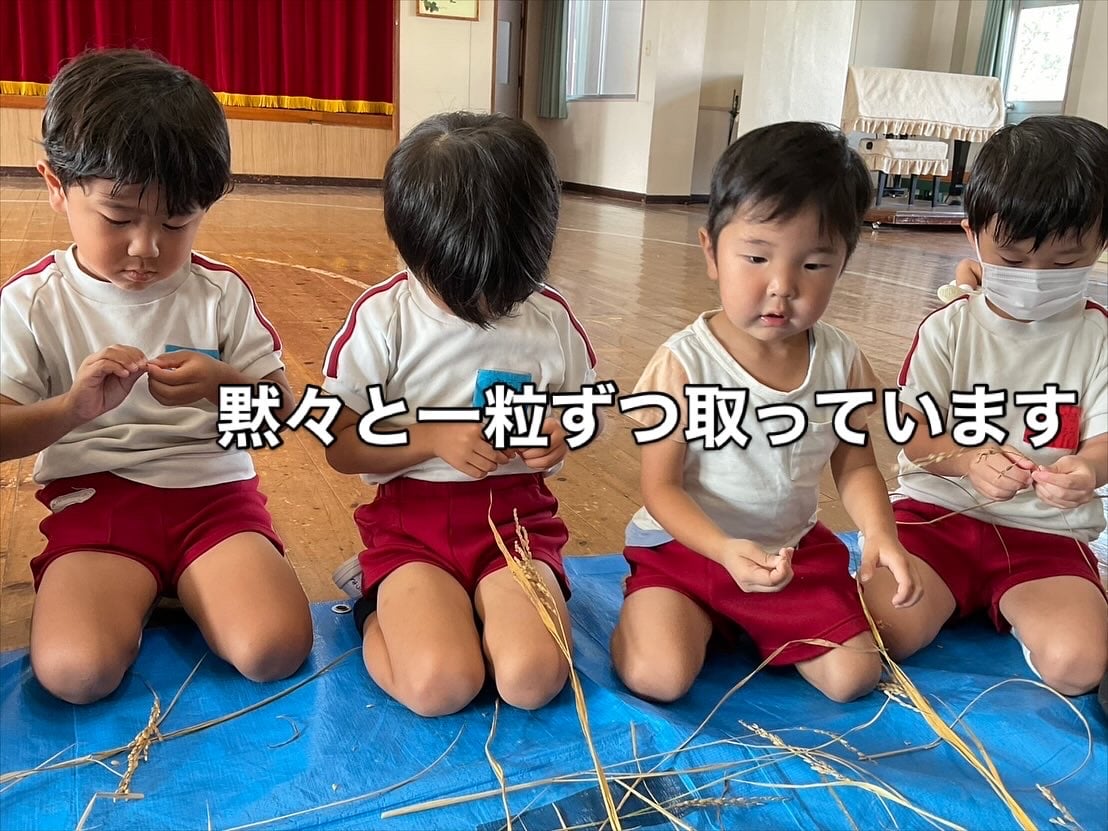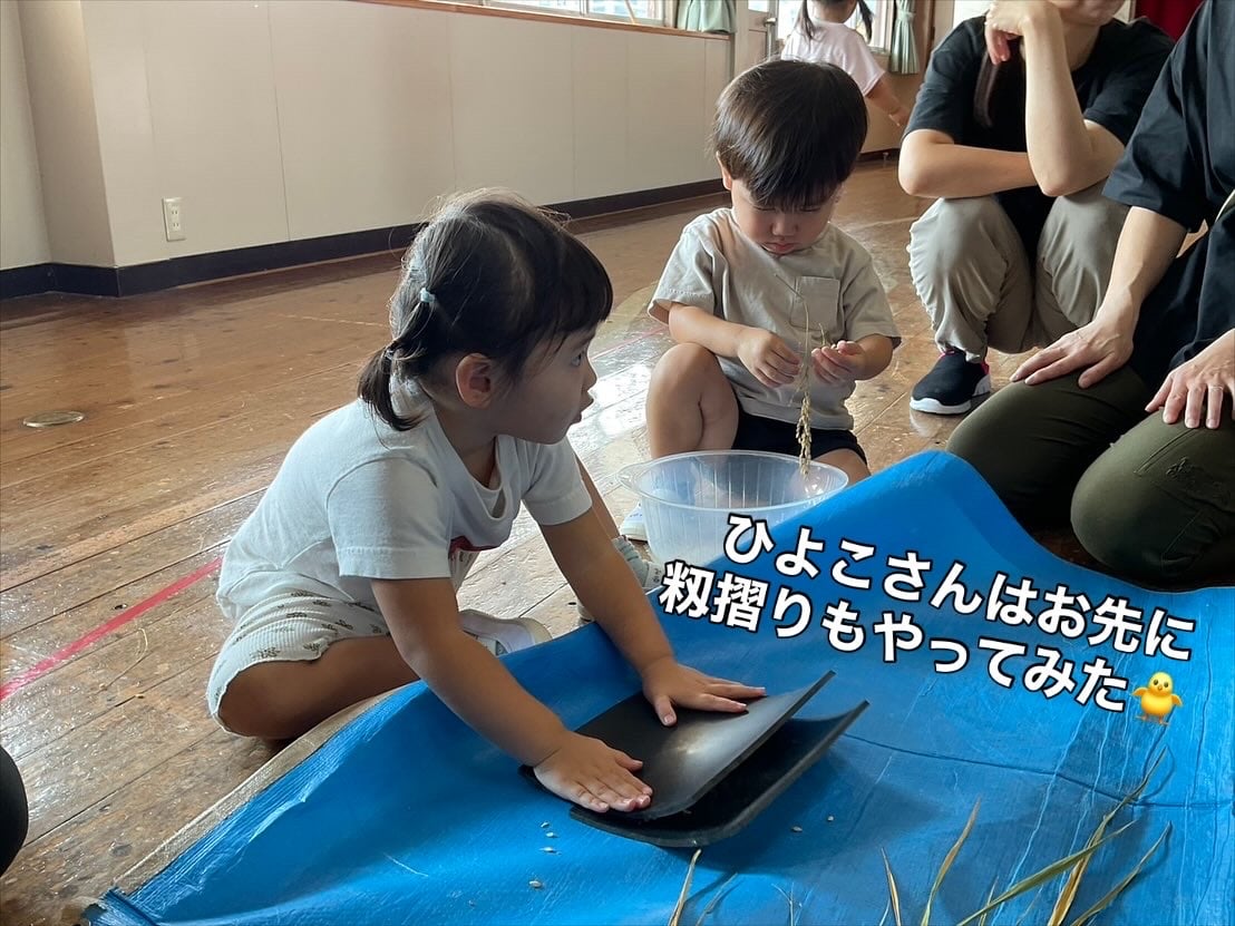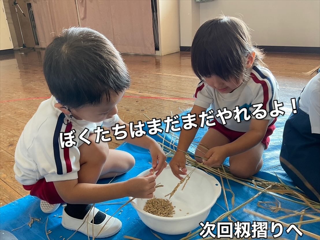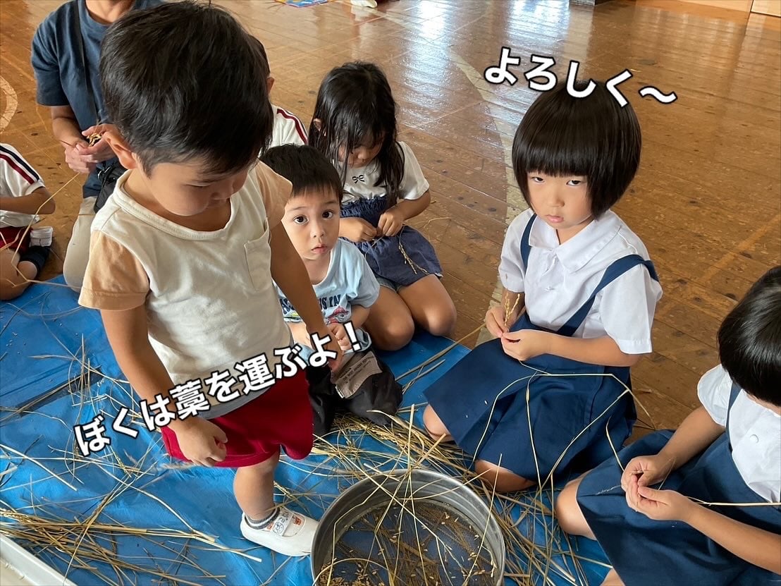 脱穀体験!🌾1粒1粒丁寧に外していきます。黙々ととる子ども達、藁をえっさと運ぶ子どもも💨