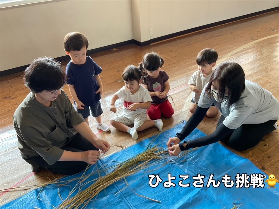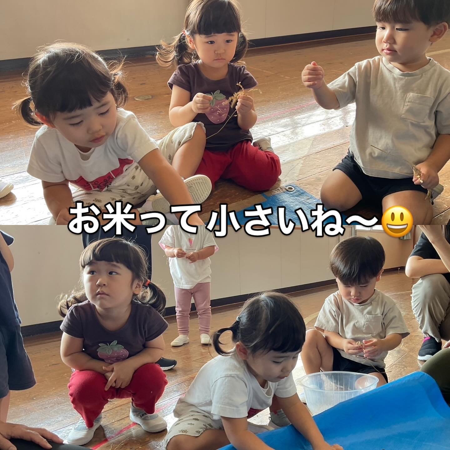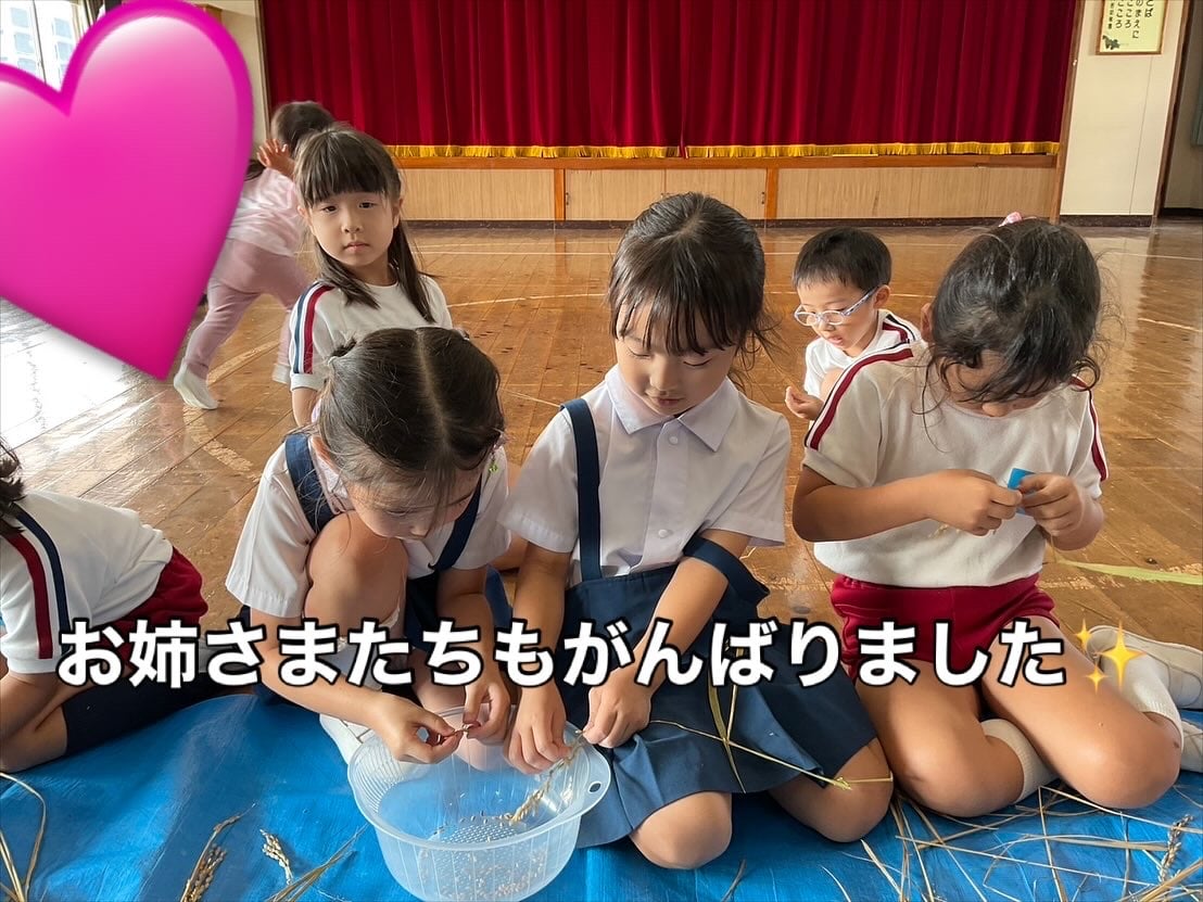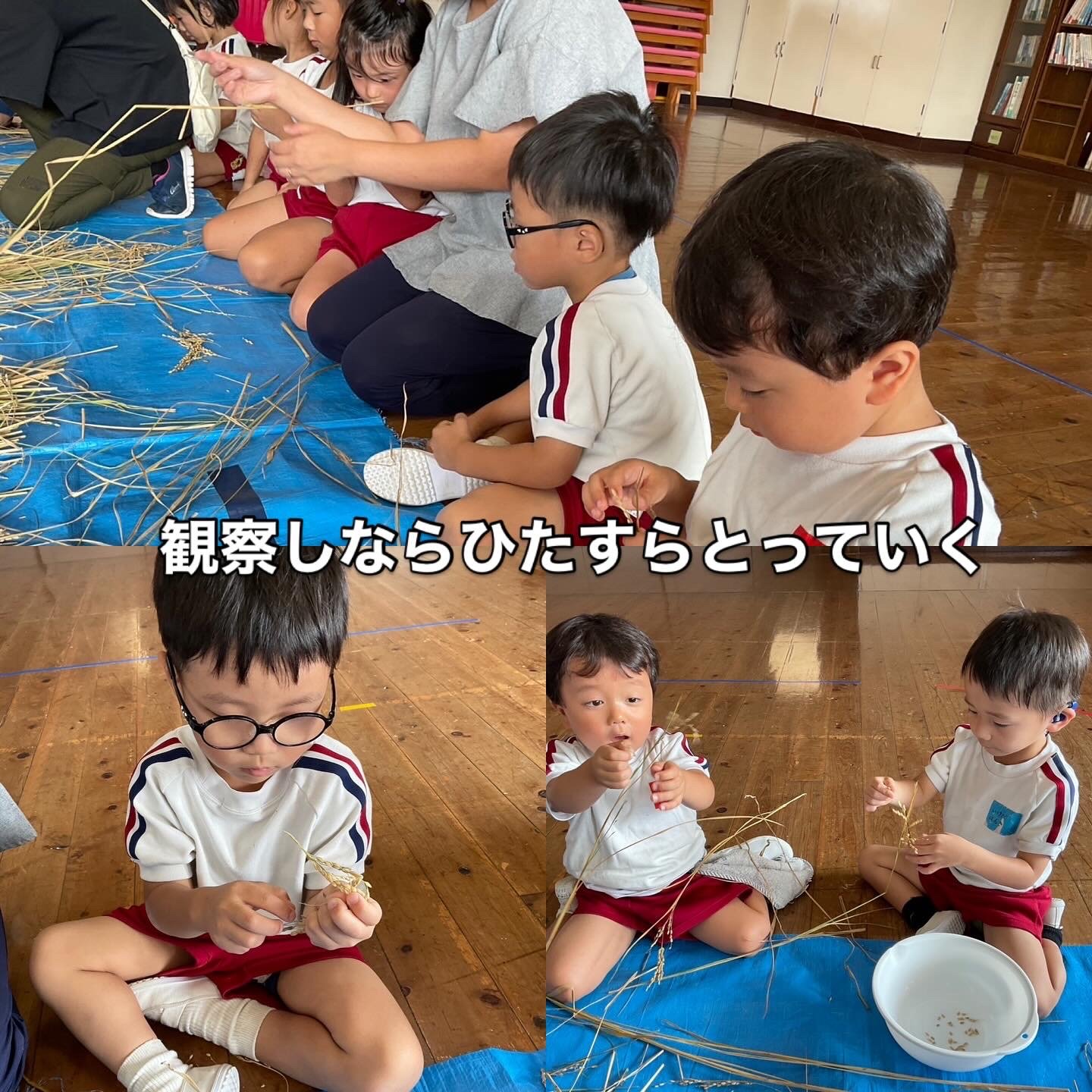 脱穀体験!🌾1粒1粒丁寧に外していきます。黙々ととる子ども達、藁をえっさと運ぶ子どもも💨