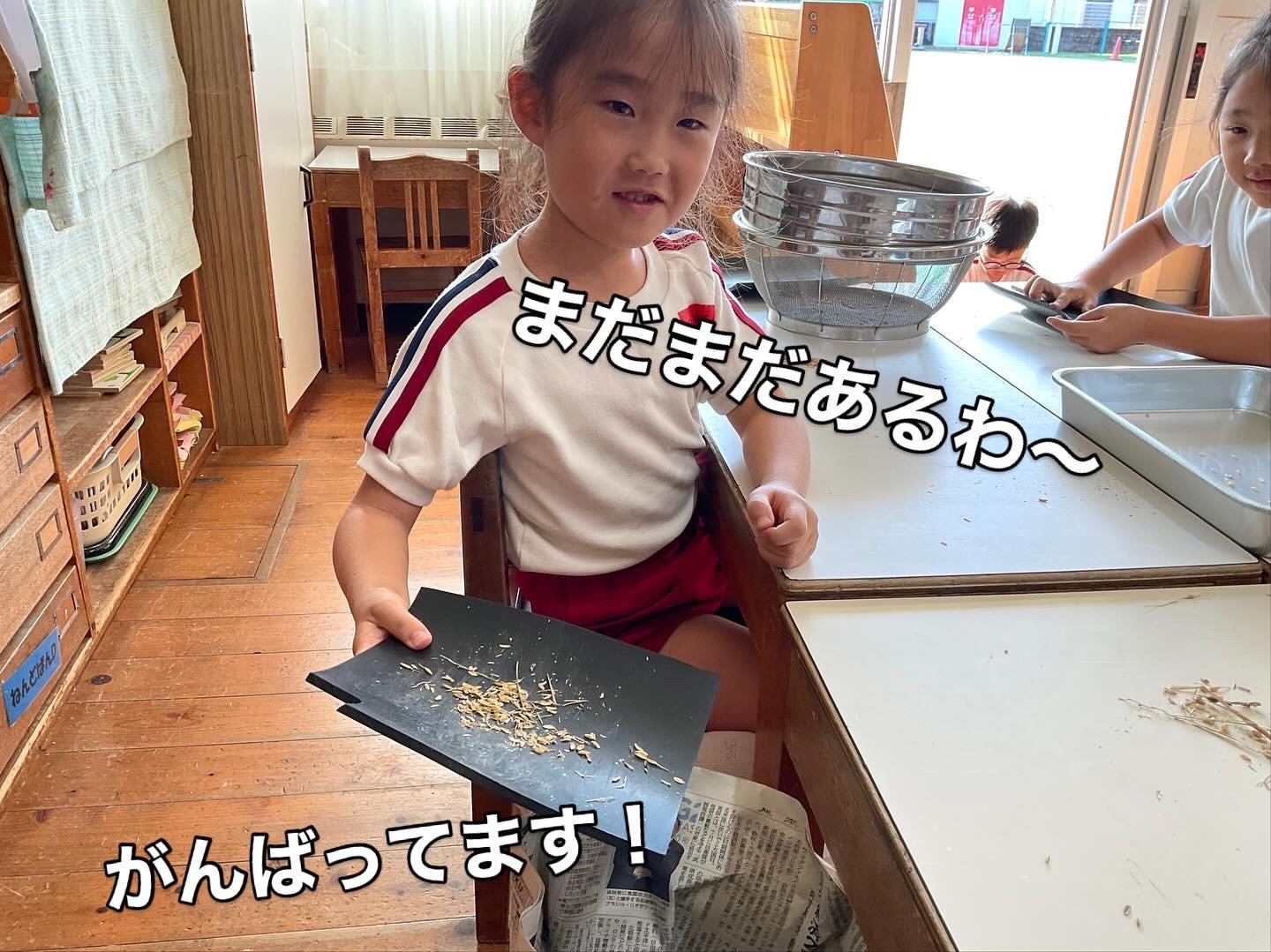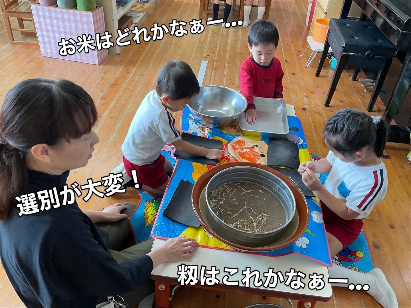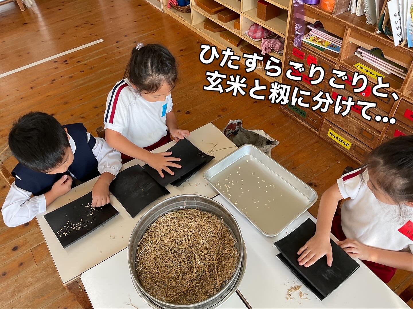 その中でさすがは年長さん。集中してゴリゴリ、選別、玄米と籾に分けて、を繰り返して無事終了!掃除班もせっせと働きます。
