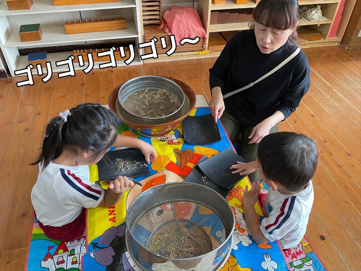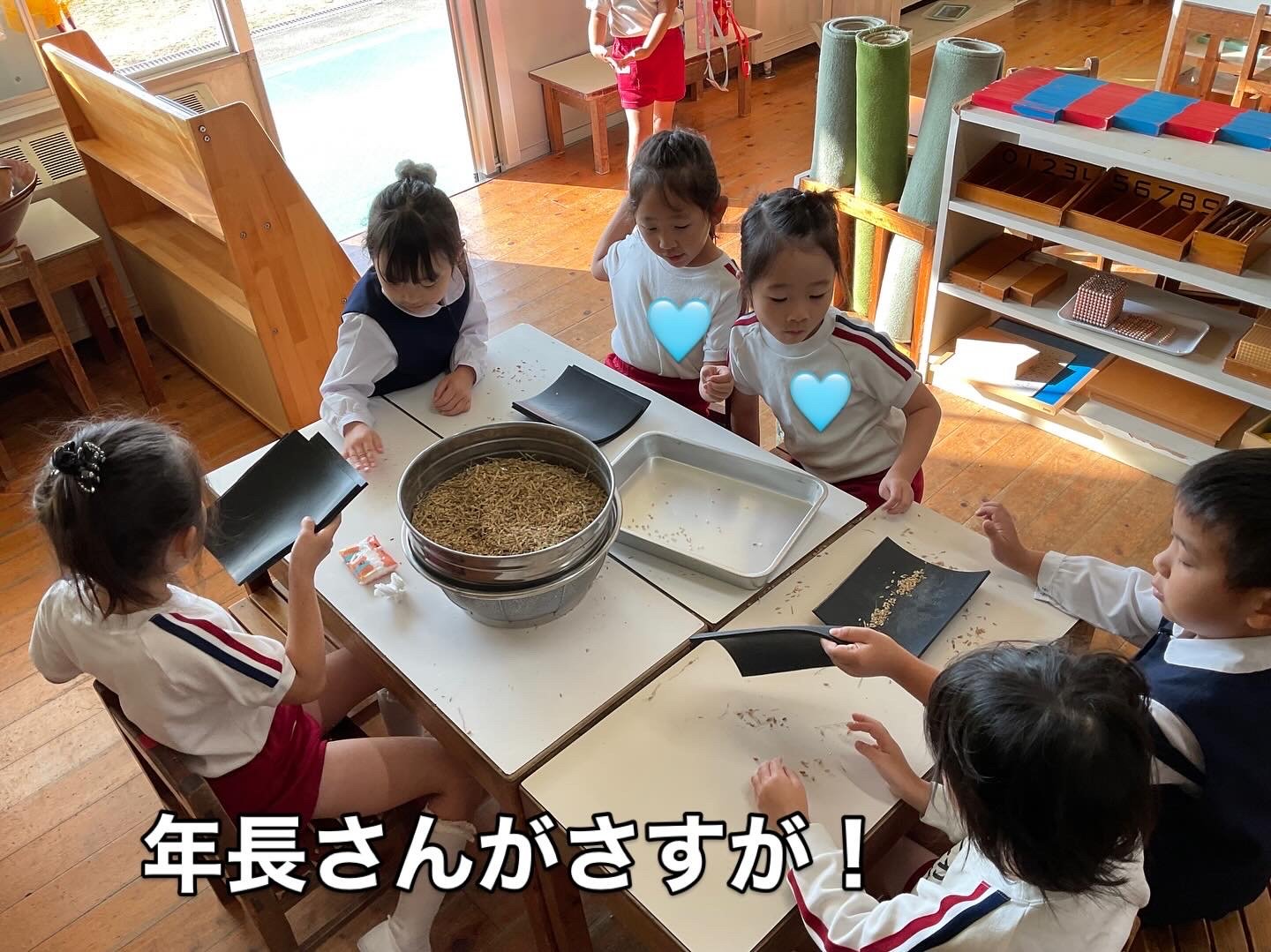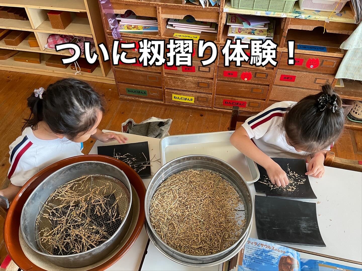 その中でさすがは年長さん。集中してゴリゴリ、選別、玄米と籾に分けて、を繰り返して無事終了!掃除班もせっせと働きます。