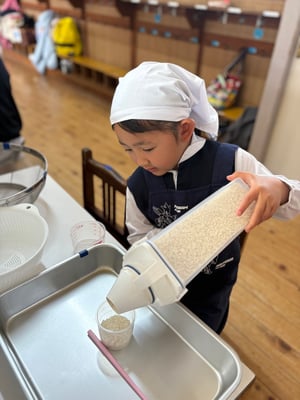 「お米がこぼれないように~手を添えて~」