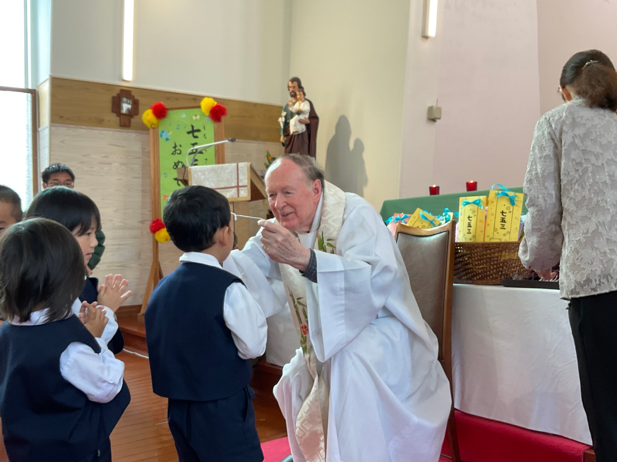 神父様から祝別をしていただいたおメダイとお菓子を頂いて、こどもたちは嬉しそうでした。これからも神様に見守られながら元気に大きくなって下さいね。