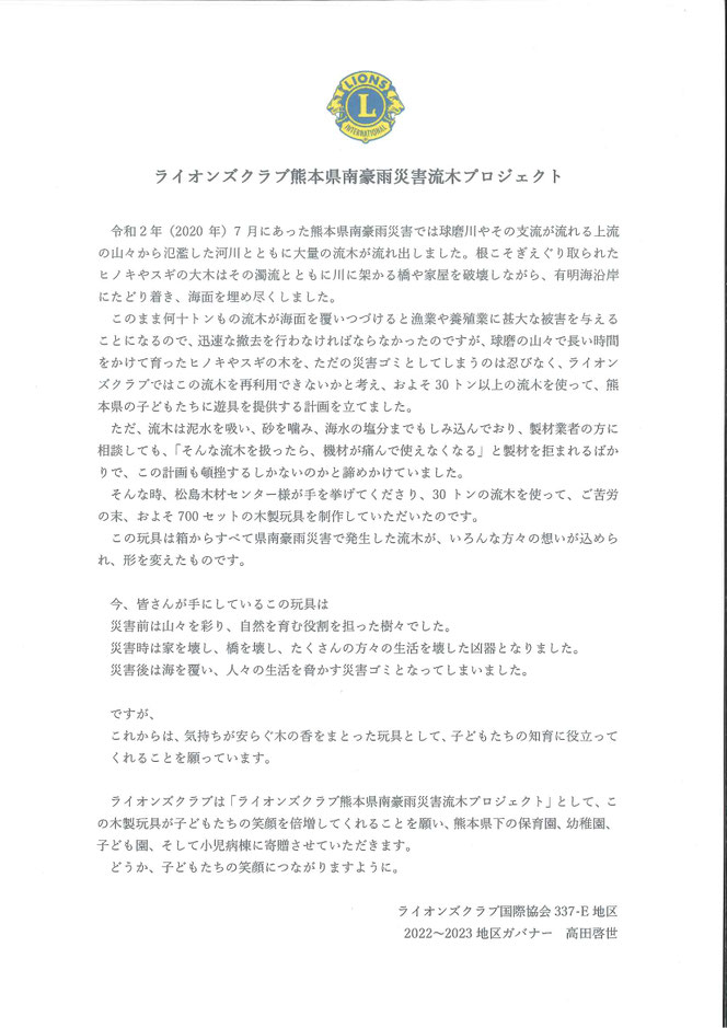 11日 5月 2023 ジェンガをいただきました! ライオンズクラブ熊本県南豪雨災害流木プロジェクトの一環でジェンガをいただきました。木の香りがとてもよく、子どもたちも鼻に近づけて「いい匂い~」「温泉のにおいがするね~」と遊びも香りも楽しんでいます。 いろんな方の思いを受け止めて、大切に使います。 ライオンズクラブ様からの手紙 tagPlaceholderカテゴリ: