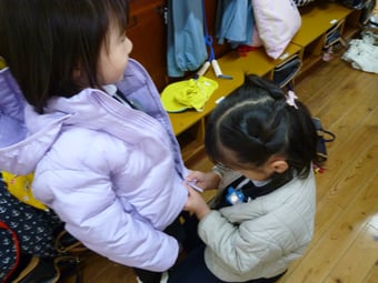 帰りの準備、廊下では年中さんが年少さんのコートの前をしめるお手伝い。